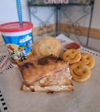 Toasted cheese, Turkey & Cheese, or Ham & Cheese served with a cookie, a drink & potato smiles.